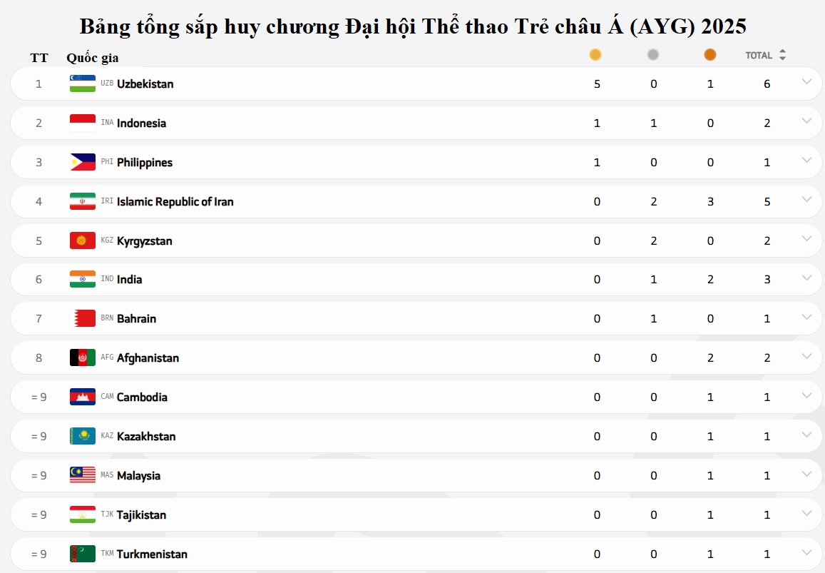 Chi tiết bảng tổng sắp huy chương Đại hội Thể thao Trẻ châu Á (AYG) 2025