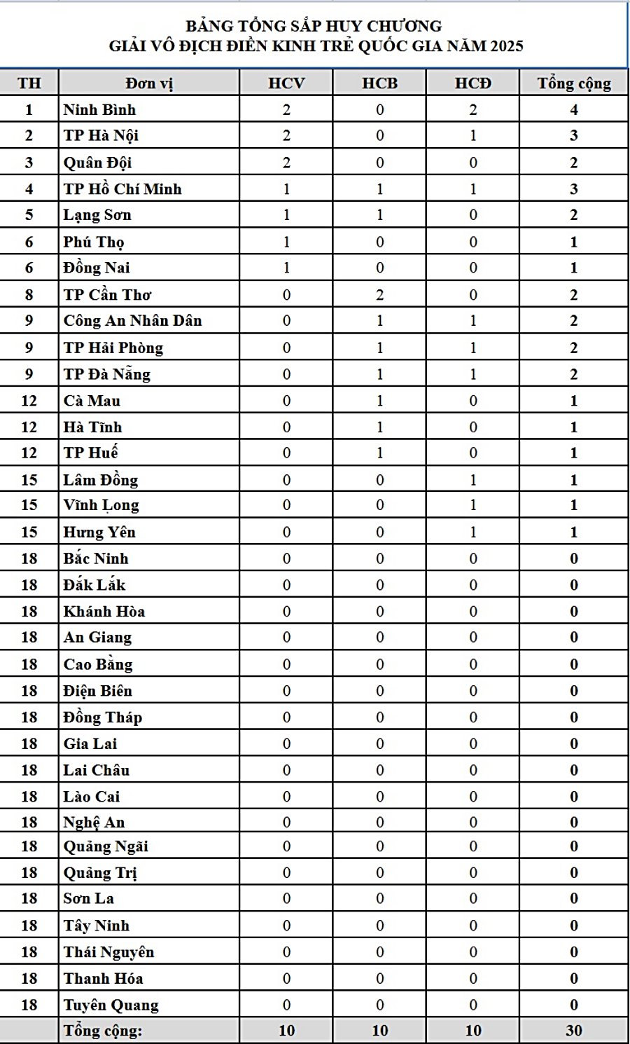 Bảng tổng sắp huy chương giải Vô địch Điền kinh Trẻ quốc gia 2025 sau ngày thứ nhất (10-10)