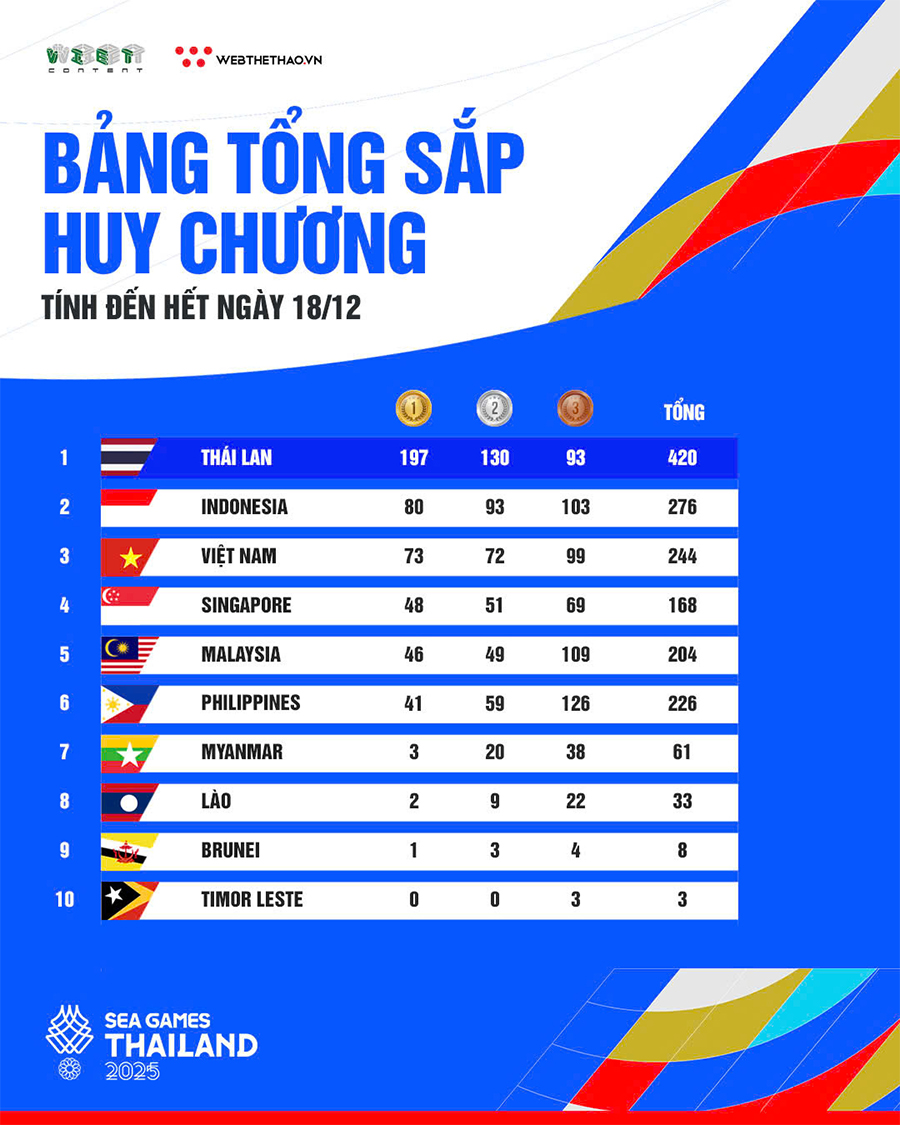 Bảng tổng sắp huy chương SEA Games 33 ngày 18/12