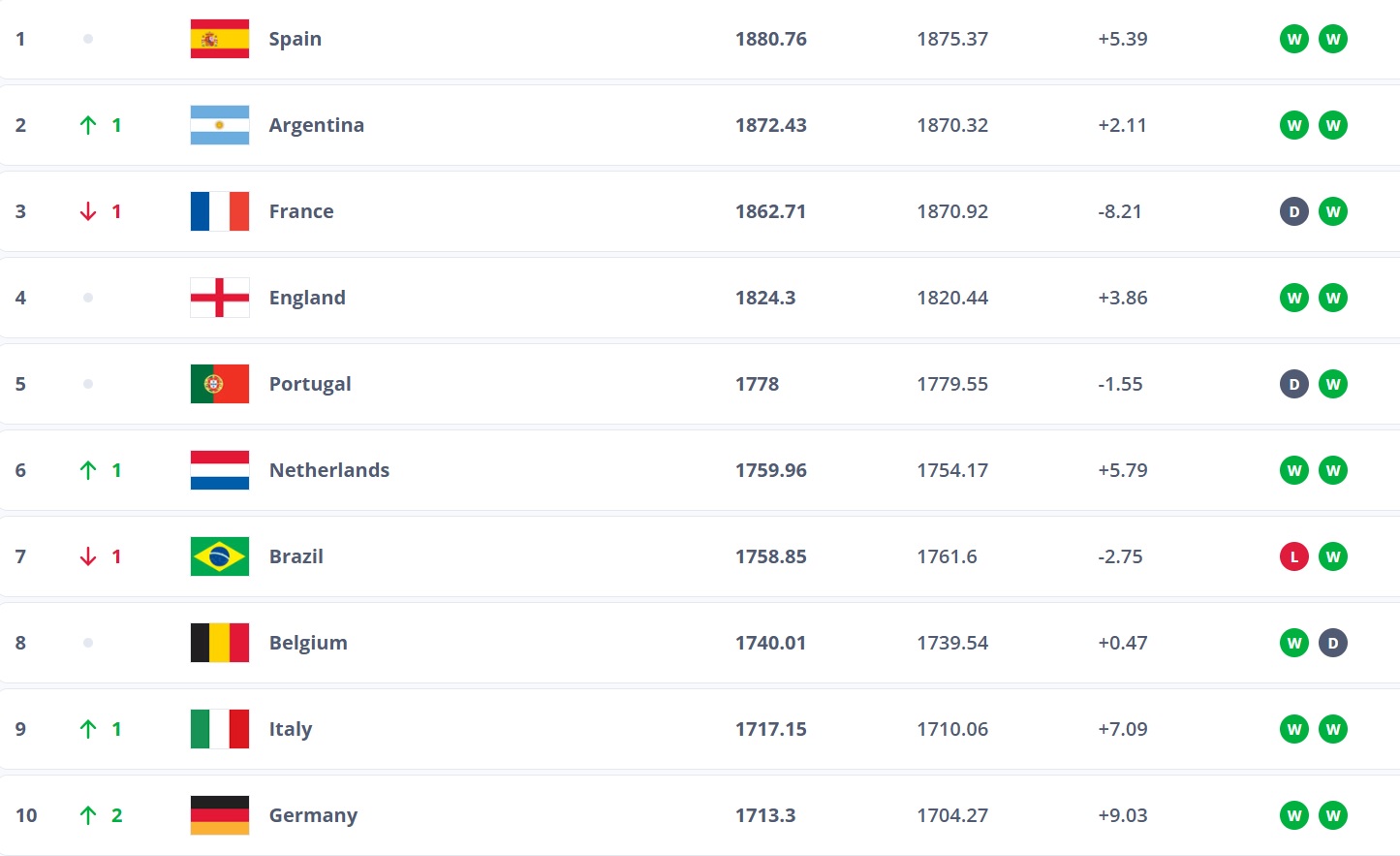 Ở phía dưới, Đức đã giành lại vị trí trong Top 10 sau một thời gian ngắn vắng mặt bằng cách tăng hai bậc lên vị trí thứ 10. Sự trở lại của họ đến từ việc Croatia, đội đã đánh mất hai điểm trong trận đấu vòng loại với tỷ số hòa 0-0 trước Cộng hòa Séc.