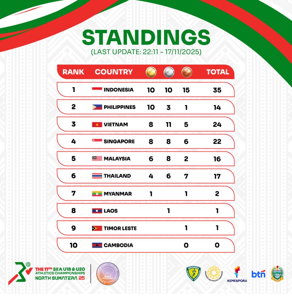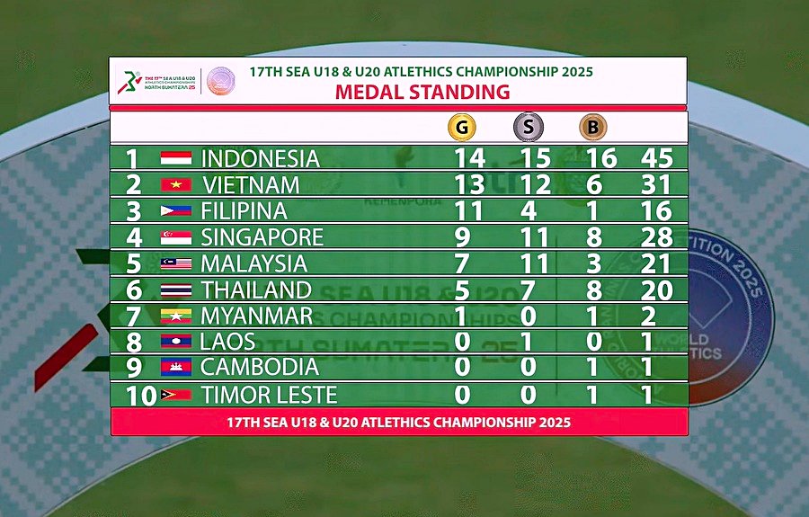 Với thành tích trên, khép lại ngày thi đấu thứ nhất, điền kinh Việt Nam vững vàng ở vị trí số 1 bảng tổng sắp huy chương giải Vô địch Điền kinh Trẻ Đông Nam Á năm 2025, tạm dẫn chủ nhà Indonesia và Philippines 2 HCV.