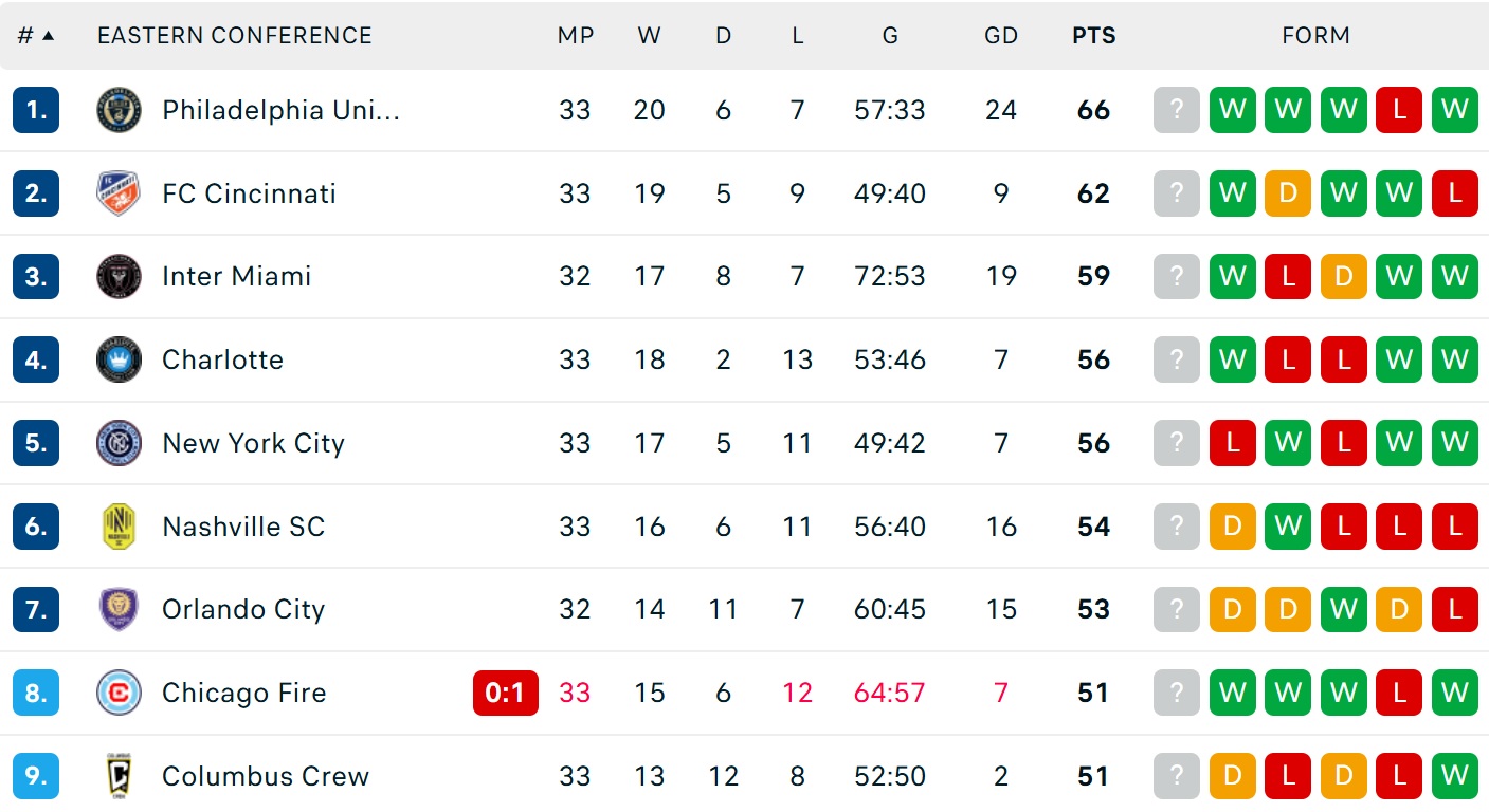 Inter Miami đánh bại New England 4-1 để vươn lên vị trí thứ 3 trên bảng xếp hạng MLS khu vực miền Đông. Với 59 điểm, họ chỉ kém đội thứ hai Cincinnati 3 điểm và đội đầu bảng Philadelphia Union 7 điểm nhưng chơi ít hơn một trận.