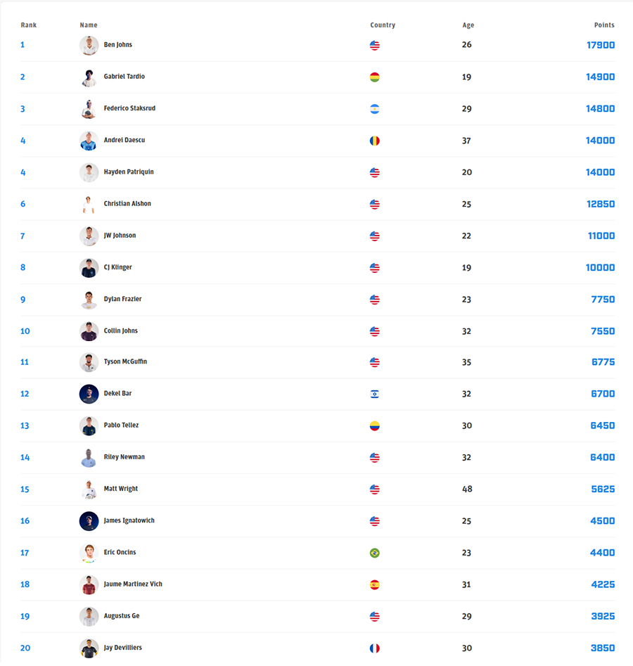 | Top 5 bảng xếp hạng pickleball thế giới đơn nam | |||