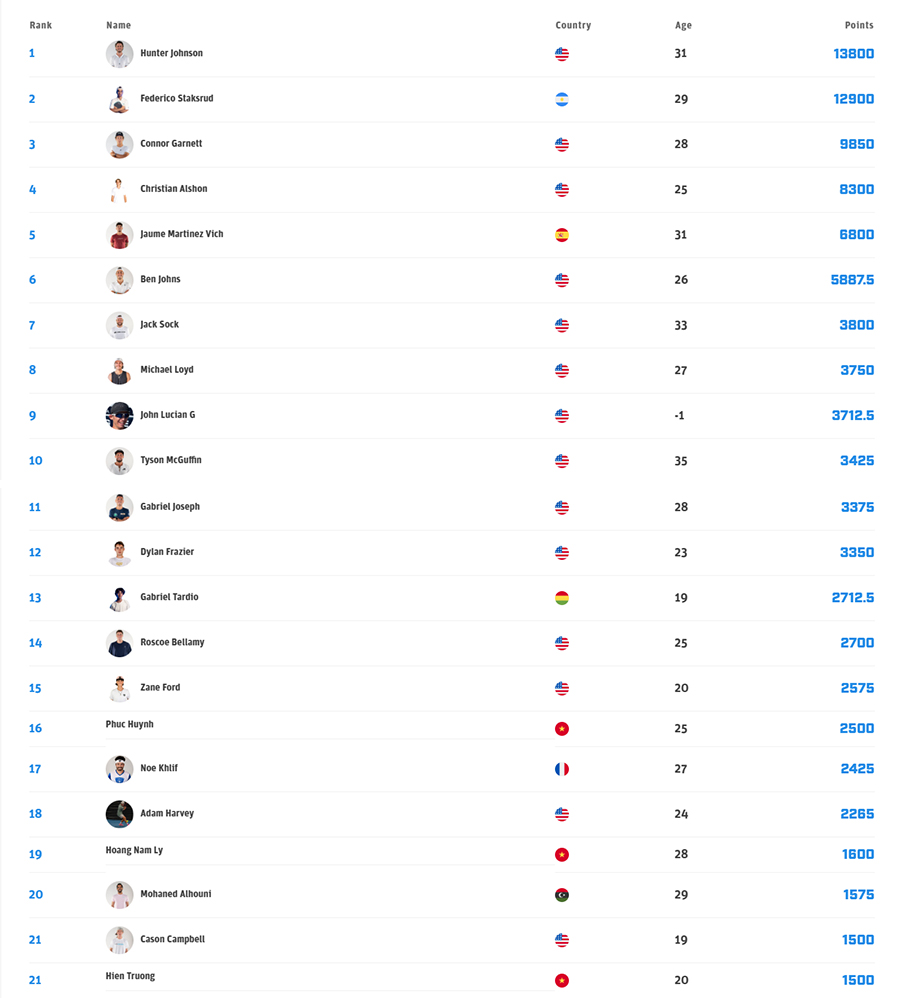 | 1 | Hunter Johnson | Mỹ | 13800 |