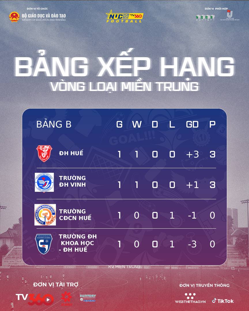 Ở bảng B, Đại học Huế tạo dấu ấn mạnh mẽ bằng chiến thắng ngược dòng ấn tượng 4-1 trước Trường Đại học Khoa học – Đại học Huế, tạm thời nắm giữ vị trí số một. Bám sát ngay phía sau là Trường Đại học Vinh, đội bóng đã vượt qua Trường Cao đẳng Công nghiệp Huế với tỷ số tối thiểu 1-0 sau một trận đấu nghẹt thở.