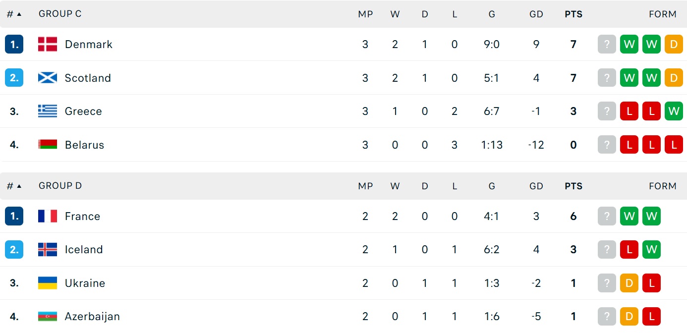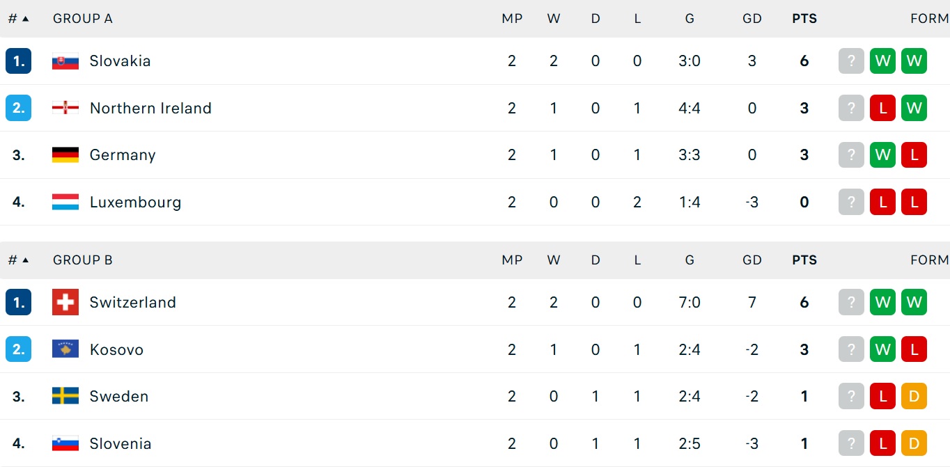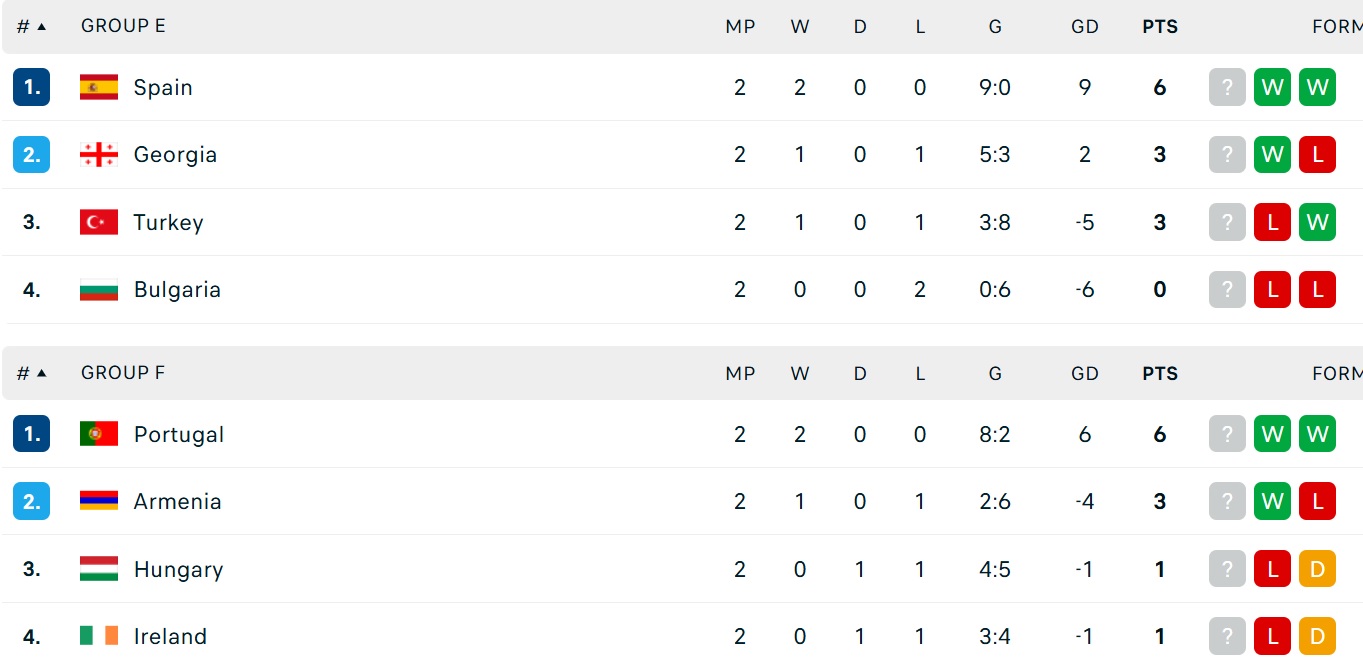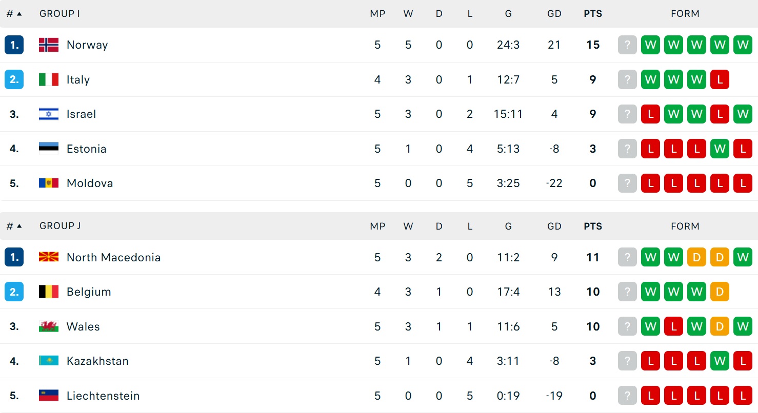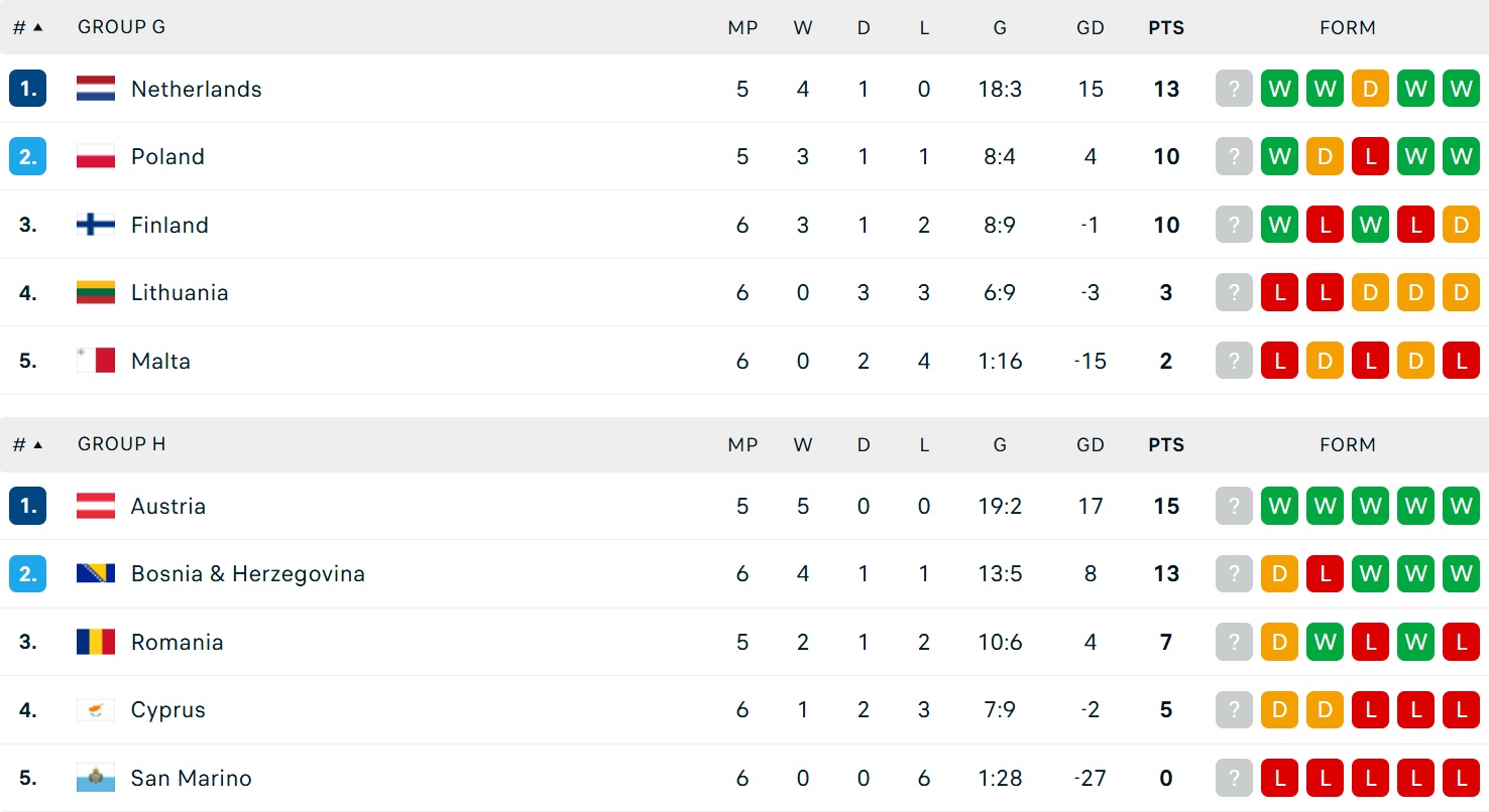 Bảng xếp hạng vòng loại World Cup 2026 khu vực châu Âu ngày 10/10
