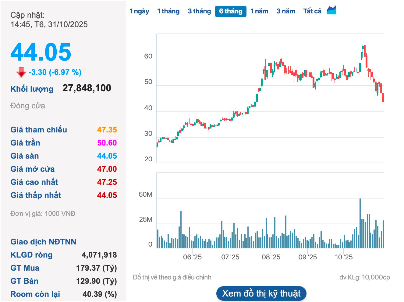Trên thị trường chứng khoán, kết phiên 31/10, cổ phiếu GEX của GELEX giảm sàn phiên thứ 2 liên tiếp còn 44.050 đồng/cp.