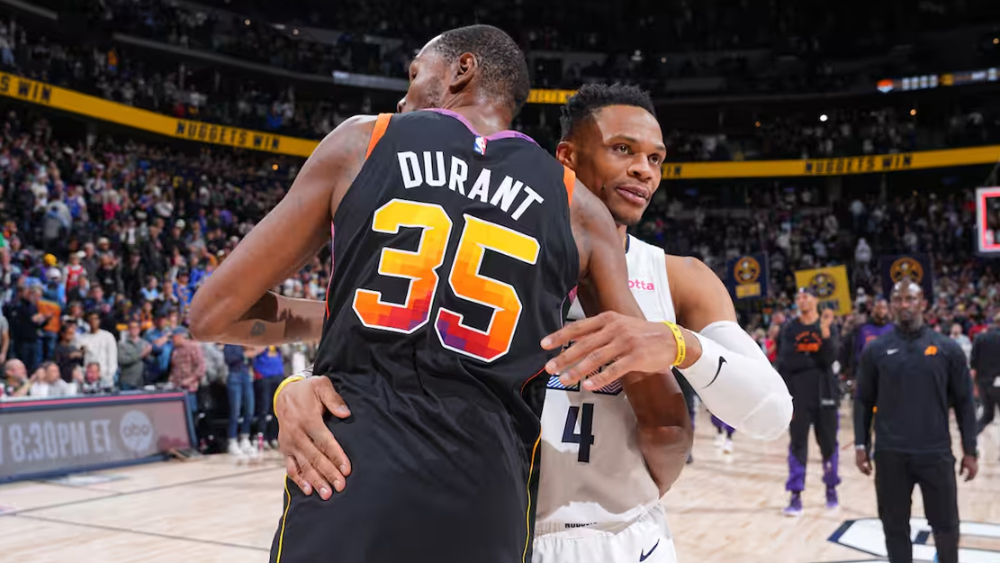 Durant và Westbrook ôm nhau sau một trận đấu ở mùa giải 2024-25
