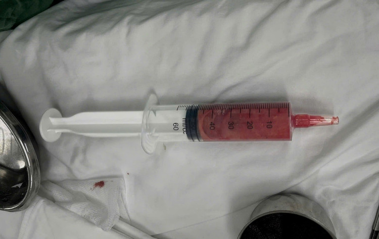 Ê-kíp phẫu thuật đã hút ra khoảng 100ml dịch mủ đục, loãng, lẫn chất filler nhầy, có mùi hôi. Sau đó, bác sĩ tiến hành rạch rộng, làm sạch ổ áp xe và dẫn lưu để kiểm soát nhiễm trùng.