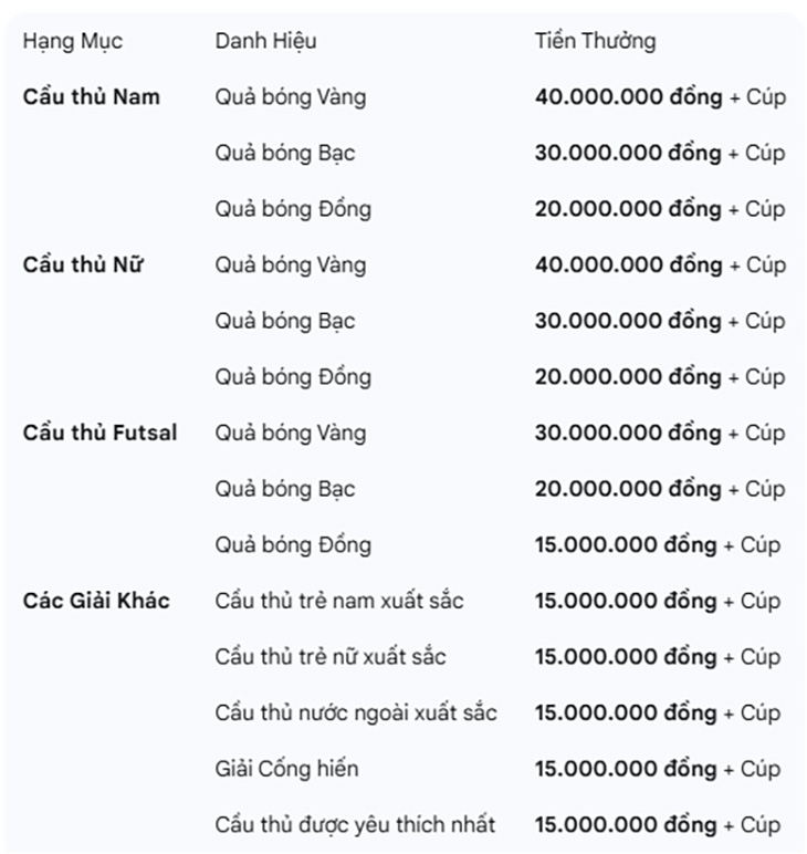 Năm nay, BTC đã công bố mức tiền thưởng hấp dẫn kèm theo Cúp lưu niệm cho từng danh hiệu, nhấn mạnh sự tôn vinh xứng đáng dành cho các cá nhân xuất sắc.