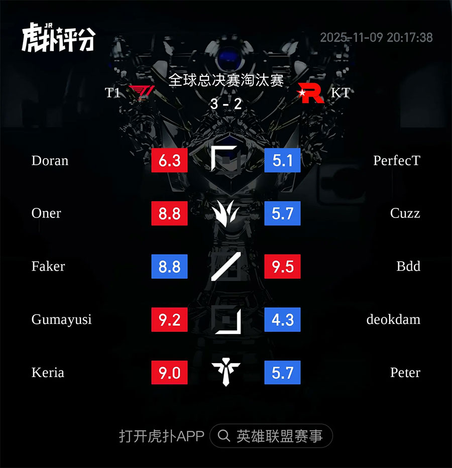 Tuyển thủ bị chấm điểm thấp nhất bên phía T1 là Doran (6.3). Faker và Gumayusi cũng được cộng đồng HUPU đánh giá cao với 8.8 điểm.