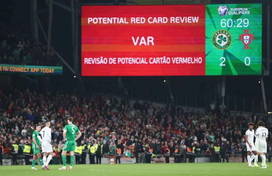 Ronaldo đã thúc cùi chỏ vào cầu thủ người Ireland khi cả hai tranh chấp trong vòng cấm, chờ đợi một quả tạt. Trọng tài người Thụy Điển Glenn Nyberg ban đầu rút thẻ vàng, nhưng sau khi xem lại VAR, ông đã thay đổi quyết định và rút thẻ đỏ trực tiếp cho cầu thủ người Bồ Đào Nha.