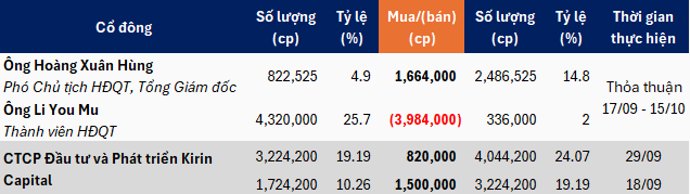 Đáng nói, lượng cổ phiếu mà ông Hùng và Kirin Capital mua vào đúng bằng lượng ông Li You Mu bán ra. Thực tế ghi nhận trong các phiên 18/09, 24/09 và 29/09 cũng cho thấy tổng khối lượng thỏa thuận gần 4 triệu cp như trên. Do đó, khả năng cao đã có sự chuyển giao sở hữu giữa các cổ đông này.