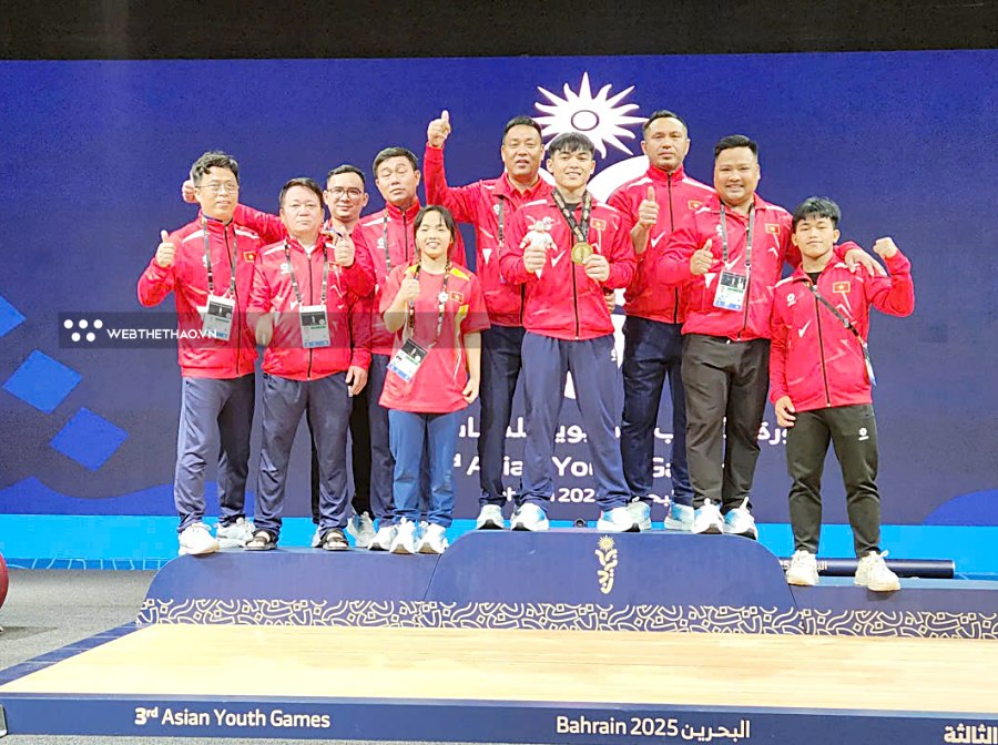 Lãnh đạo đoàn Thể thao Việt Nam chia vui cùng ban huấn luyện đội tuyển cử tạ và đô cử Nguyễn Thành Duy sau tấm HCV đầu tiên tại Đại hội Thể thao Trẻ châu Á 2025