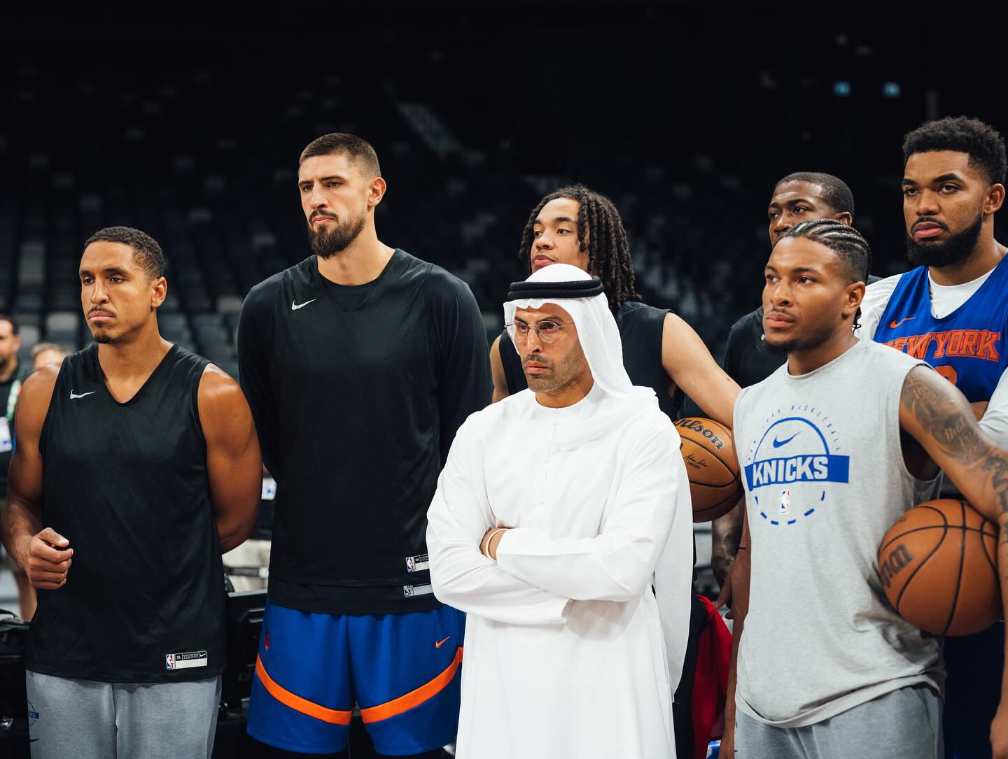 Ông Al Mubarak (áo trắng) đứng cùng các cầu thủ New York Knicks trong một buổi tập trước NBA Abu Dhabi Games 2025