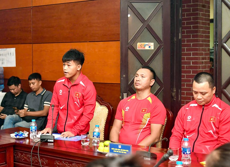 Hùng Văn Thế thay mặt các VĐV trẻ Việt Nam phát biểu tại lễ xuất quân đoàn Thể thao Việt Nam dự AYG 2025