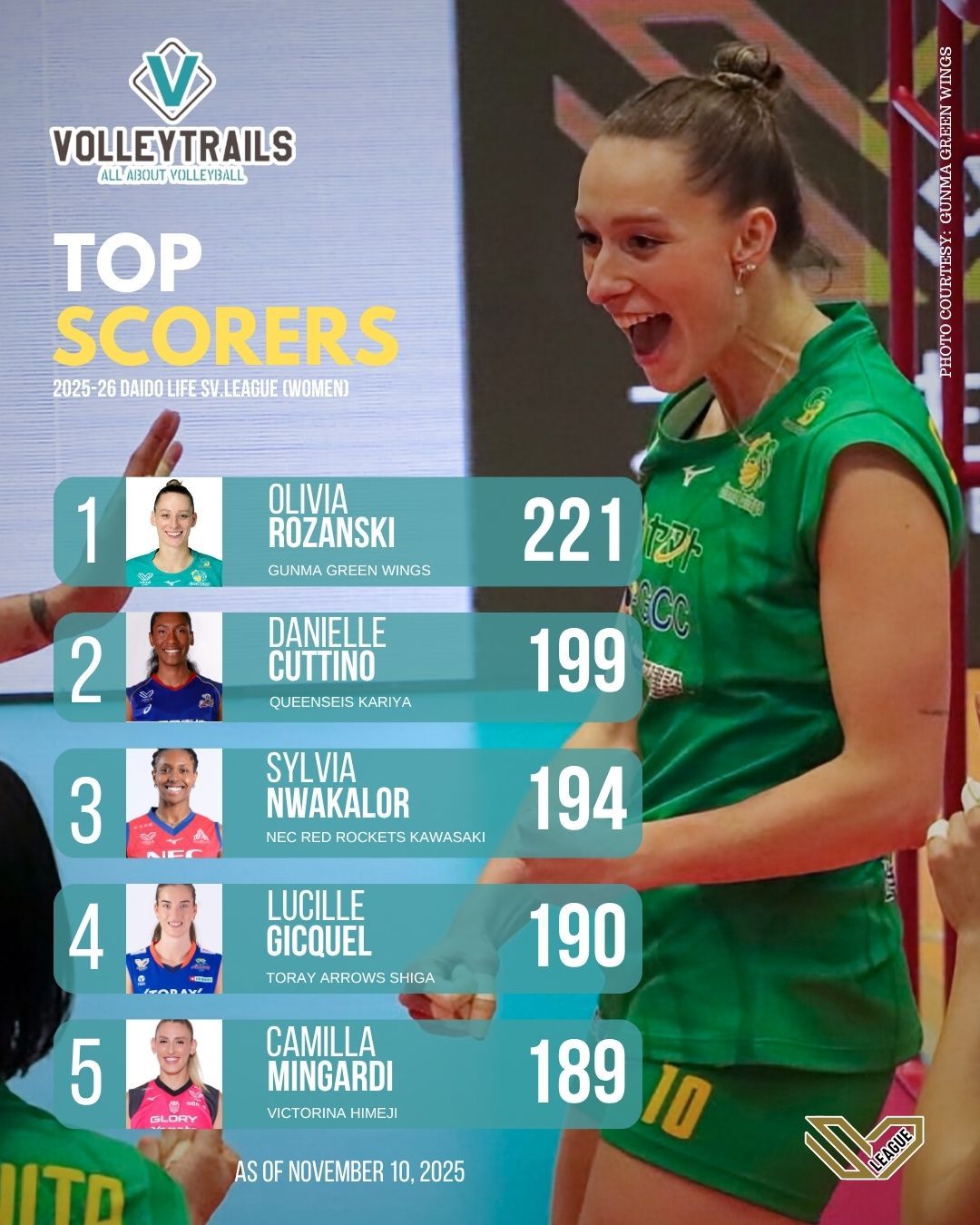 Olivia Rozanski – ngôi sao người Ba Lan đang khoác áo Gunma Green Wings cùng Trần Thị Thanh Thúy – tiếp tục chứng minh phong độ chói sáng tại giải bóng chuyền nữ VĐQG Nhật Bản mùa 2025–26. Tính đến ngày 10/11/2025, Rozanski đang dẫn đầu danh sách ghi điểm với 221 điểm, trở thành tay đập hiệu quả nhất giải đấu sau 10 vòng.