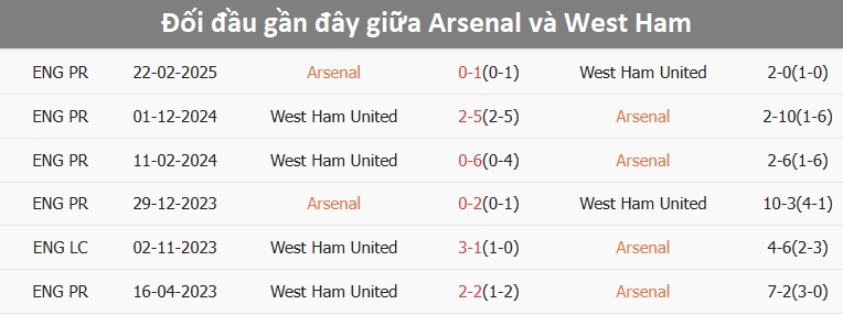Tỷ lệ trận đấu: Arsenal thua West Ham 4/6 cuộc đối đầu trước đó theo tỷ số châu Á. Arsenal thắng 2 và thua 2 trong 4 trận vừa qua. Về phần mình, West Ham thắng trận mới nhất.