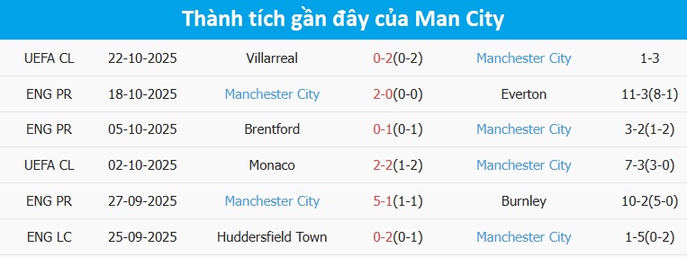 Tổng bàn thắng cả trận: 6/8 trận gần đây của Man City dưới mốc tổng bàn thắng, giữ sạch lưới cả 3 trận mới nhất.