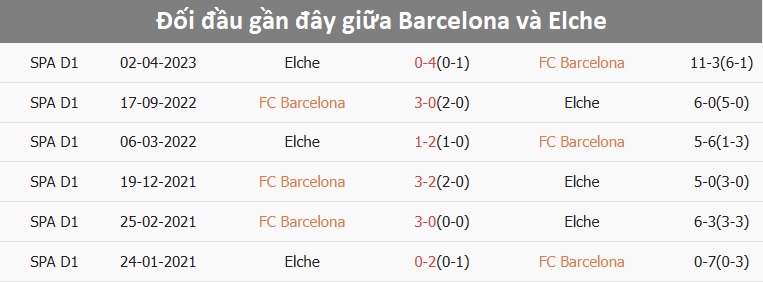 Tổng bàn thắng cả trận: 6/9 trận gần đây của Barcelona dưới mốc tổng bàn thắng. Điều tương tự cũng xảy ra ở 3 trận mới nhất của Elche.