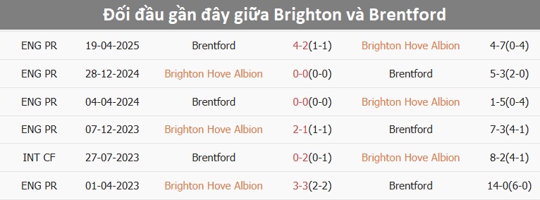 Tỷ lệ trận đấu: Brighton thua Brentford cả 2 cuộc đối đầu mới nhất theo tỷ số châu Á. Brighton thắng 2 và thua 2 trong 4 trận vừa qua. Về phần mình, Brentford thắng 4/5 trận gần đây.