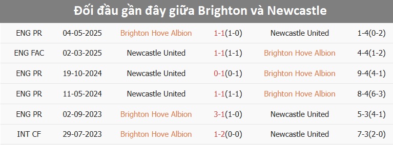 Tổng bàn thắng cả trận: 4/5 trận gần đây của Brighton vượt mốc tổng bàn thắng. Điều tương tự cũng xảy ra ở 3/4 trận vừa qua của Newcastle.
