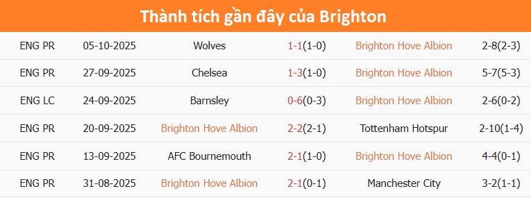 Tỷ lệ trận đấu: Brighton thua 3/4 trận gần đây ở Ngoại hạng Anh theo tỷ số châu Á. Về phần mình, Chelsea thắng 3/4 trận mới nhất.