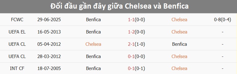 Tỷ lệ trận đấu: Chelsea trải qua 5 trận thua liên tiếp theo tỷ số châu Á. Về phần mình, Benfica cũng thua 5/6 trận gần đây.