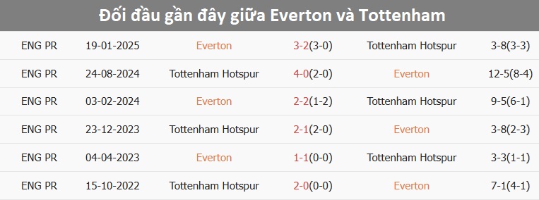 Tỷ lệ trận đấu: Everton thắng 3/5 trận sân nhà gần đây theo tỷ số châu Á. Về phần mình, Tottenham chỉ thắng 1/5 trận trước đó.
