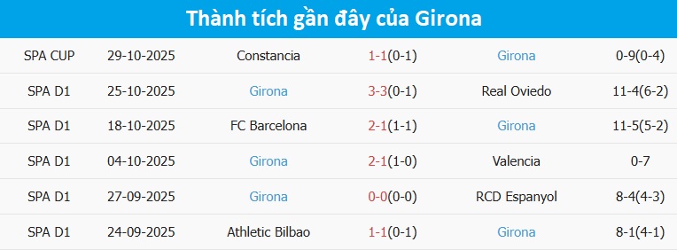 Girona vẫn đứng cuối bảng với vỏn vẹn 7 điểm sau 10 vòng đấu. Đánh bại Valencia hồi đầu tháng 10 là chiến thắng duy nhất của họ, trong khi những kết quả nghèo nàn còn lại phản ánh tình trạng tồi tệ điển hình mà đội bóng trải qua từ đầu mùa. Girona không chỉ ghi bàn ít thứ hai giải đấu mà còn lọt lưới nhiều nhất, khiến hy vọng kiếm điểm trên sân Getafe tuần này ít khả dĩ.