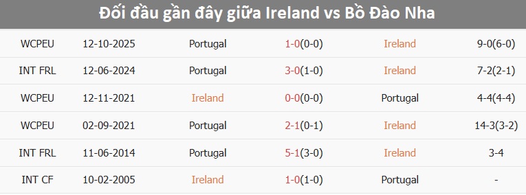 Tỷ lệ trận đấu: Ireland thua 4/5 trận gần đây theo tỷ số châu Á. Phía bên kia, Bồ Đào Nha thua 2 trận mới nhất sau khi thắng 3/4 trận trước đó.