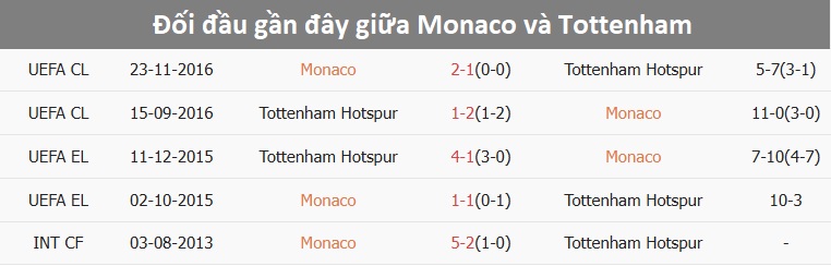 Tỷ lệ trận đấu: Monaco thắng 4 và thua 4 trong 8 trận gần đây theo tỷ số châu Á. Về phần mình, Tottenham thua 3/4 trận mới nhất.