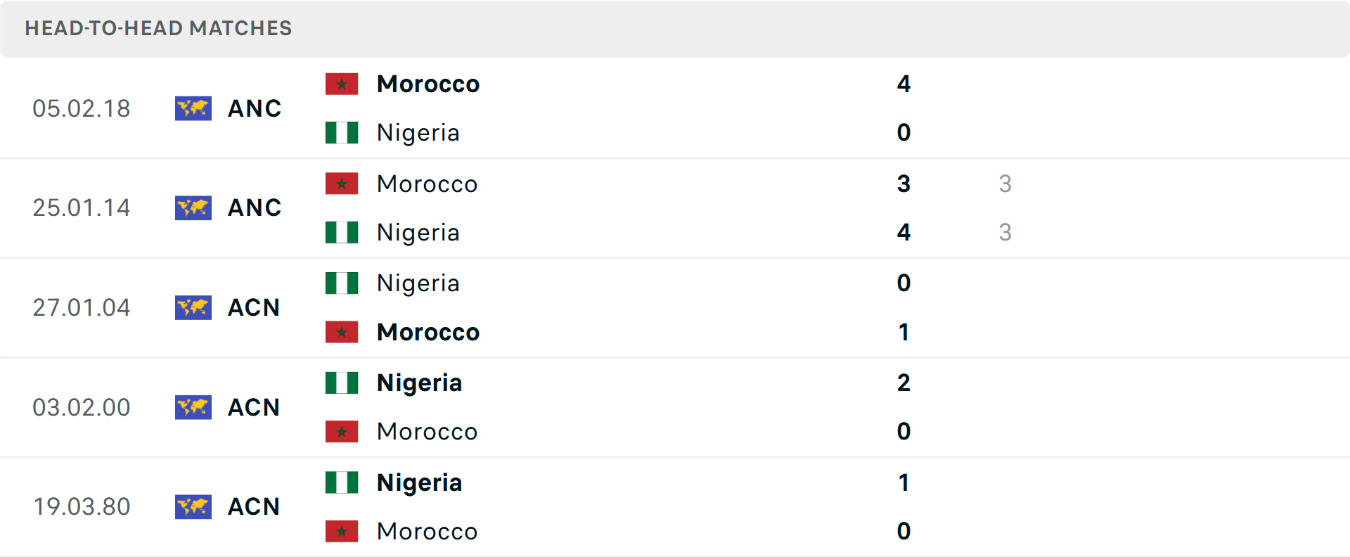 Tổng bàn thắng cả trận: Nigeria giữ sạch lưới 2 trận vừa qua. Trong khi đó, 4/5 trận gần đây của Ma rốc dưới mốc tổng bàn thắng.