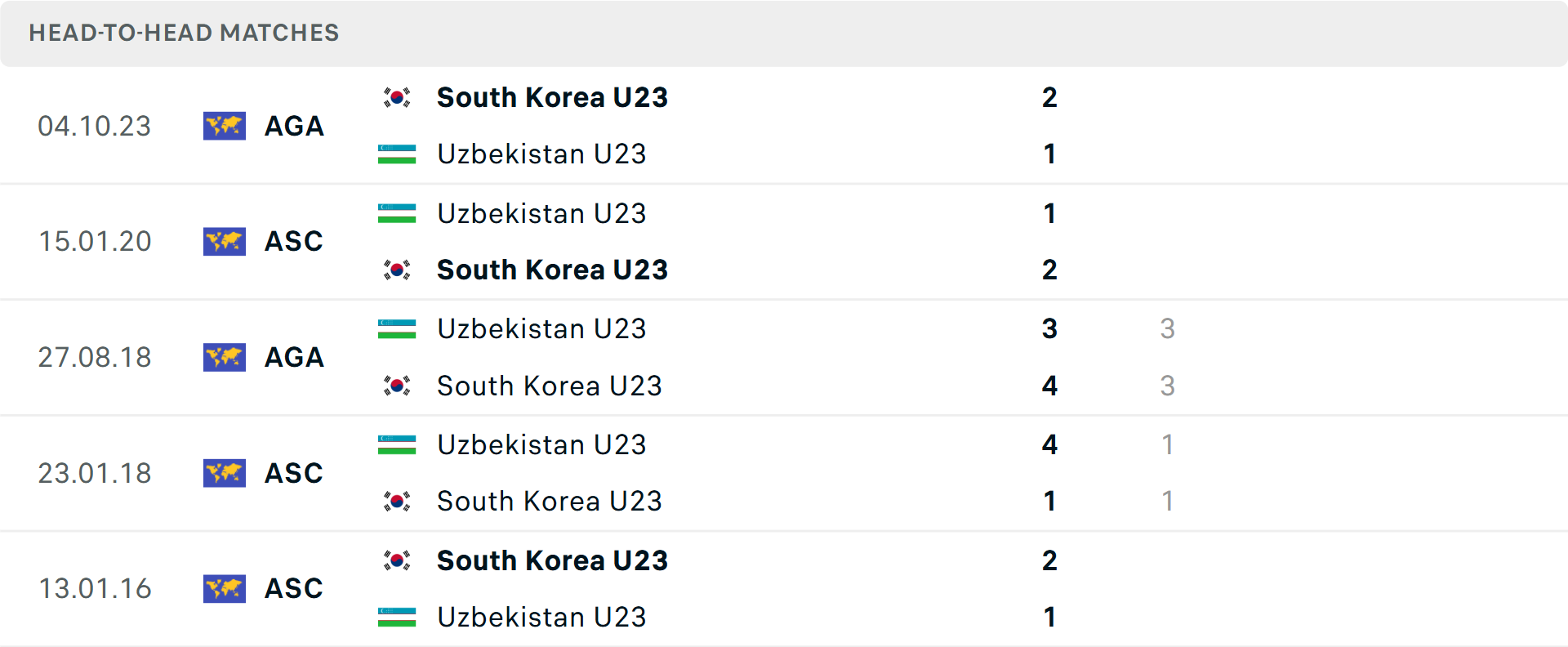 Tổng bàn thắng cả trận: 3/4 trận chính thức gần đây của U23 Uzbekistan có từ 3 bàn trở lên. Tương tự, 4/6 trận mới nhất của U23 Hàn Quốc vượt mốc tổng bàn thắng.