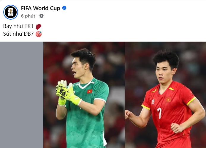 Ngay sau khi trận đấu giữa U23 Việt Nam và U23 Saudi Arabia khép lại, FIFA đã có phản ứng khiến người hâm mộ Việt Nam đặc biệt thích thú. Trên fanpage chính thức, FIFA đăng tải dòng mô tả ngắn gọn nhưng “cực chất”: “Bay như TK1, sút như ĐB7”, cô đọng trọn vẹn chiến thắng 1-0 của U23 Việt Nam trước chủ nhà Saudi Arabia.