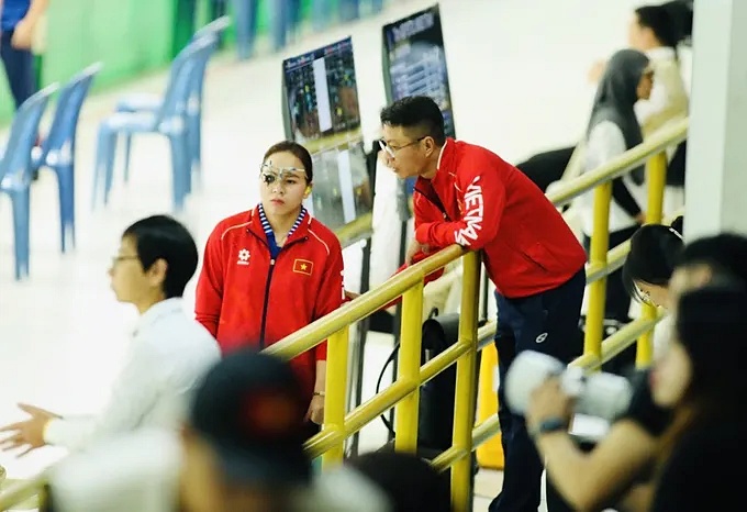HLV Quốc Cường trao đổi với Trịnh Thu Vinh ở nội dung thi đấu 10m súng ngắn hơi đôi nam nữ tại SEA Games 33