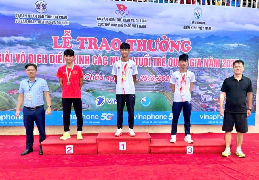 Bùi Tuấn Tú (áo đỏ, 2) nhận HCB ở giải Vô địch điền kinh các nhóm tuổi trẻ quốc gia hồi tháng 6/2025
