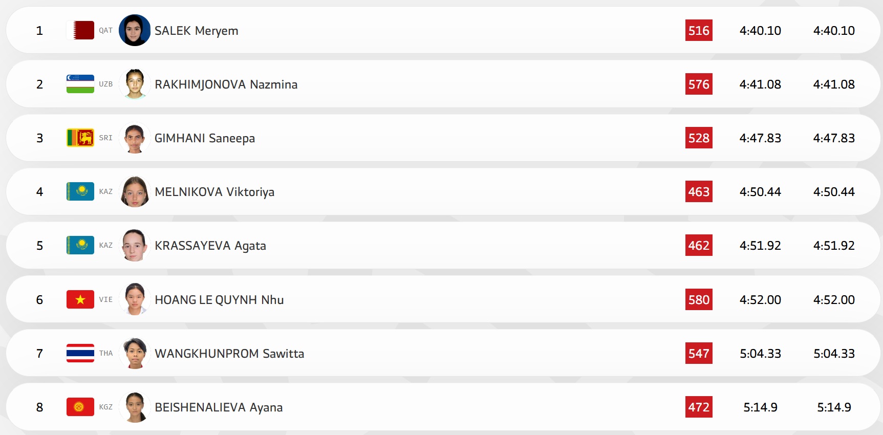 VĐV trẻ có thành tích tốt nhất ở cự ly này là Salek Meryem (16 tuổi, Qatar) với thông số 4:40.10. Ngoài ra, những VĐV tốt kế tiếp đến từ Uzbekista, Sri Lanka và Kazakhstan.