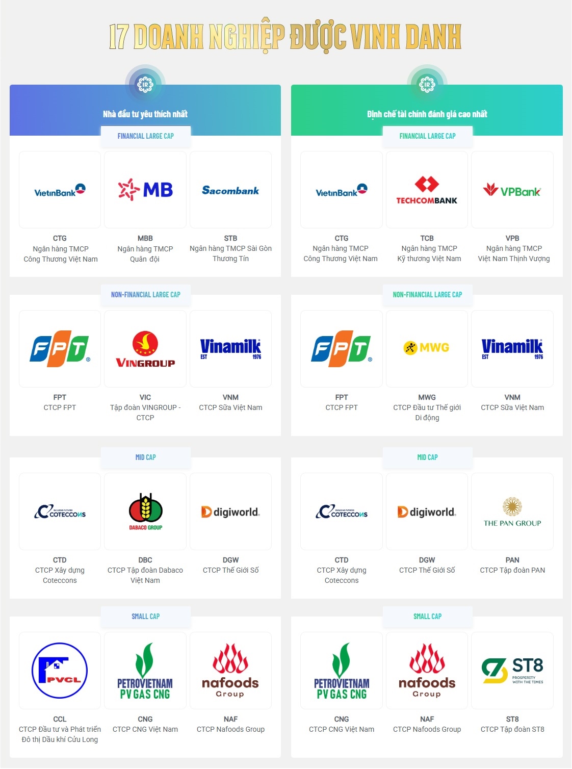Đây là những doanh nghiệp đáp ứng đầy đủ và nổi bật theo Bộ tiêu chí Đề cử IR Awards 2025 - bộ tiêu chuẩn khắt khe đánh giá về chất lượng công bố thông tin, tính minh bạch tài chính và quản trị công ty.