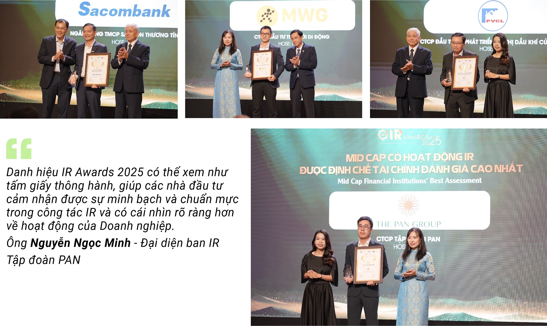 Ông Nguyễn Ngọc Minh - Đại diện ban IR của Tập đoàn PAN - Top 3 Mid Cap được Định chế Tài chính đánh giá cao nhất - cho biết: Việc được các định chế tài chính công nhận là một sự ghi nhận cao quý cho doanh nghiệp niêm yết. Ông cho rằng, đây là kết quả của rất nhiều nỗ lực, từ bộ phận IR cho đến chiến lược đúng hướng của tập đoàn, giúp đạt được những kết quả tốt trong những năm vừa qua.