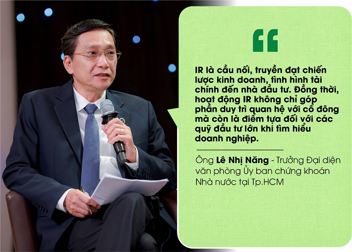 Ở góc độ của cơ quan quản lý, ông Lê Nhị Năng - Trưởng Đại diện văn phòng, Ủy ban Chứng khoán Nhà nước (UBCKNN) tại TP.HCM đánh giá IR đóng vai trò cực kỳ quan trọng với công ty đại chúng, niêm yết trên thị trường chứng khoán. IR là cầu nối, truyền đạt chiến lược kinh doanh, tình hình tài chính đến nhà đầu tư. Đồng thời, hoạt động IR không chỉ góp phần duy trì quan hệ với cổ đông mà còn là điểm tựa đối với các quỹ đầu tư lớn khi tìm hiểu doanh nghiệp. Lúc này, công tác IR tốt sẽ hỗ trợ quá trình huy động vốn dễ dàng hơn.