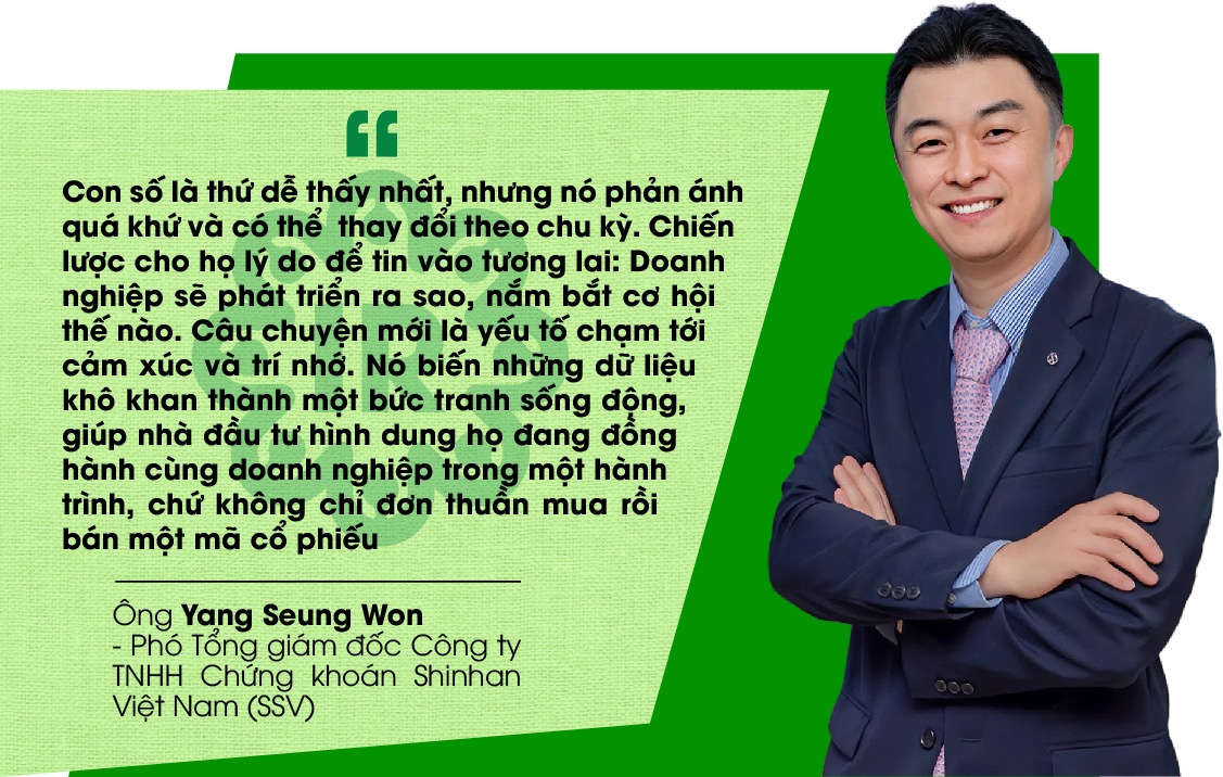 “Con số là thứ dễ thấy nhất, nhưng nó phản ánh quá khứ và có thể thay đổi theo chu kỳ. Chiến lược cho họ lý do để tin vào tương lai: Doanh nghiệp sẽ phát triển ra sao, nắm bắt cơ hội thế nào. Câu chuyện mới là yếu tố chạm tới cảm xúc và trí nhớ. Nó biến những dữ liệu khô khan thành một bức tranh sống động, giúp nhà đầu tư hình dung họ đang đồng hành cùng doanh nghiệp trong một hành trình, chứ không chỉ đơn thuần mua rồi bán một mã cổ phiếu”, ông Yang Seung Won lý giải.