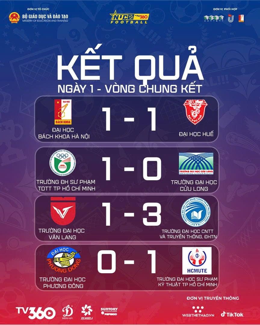 Trận mở màn VCK Giải bóng đá nam sinh viên toàn quốc 2025 Cúp TV360 trong khuôn khổ bảng A giữa Đại học Bách Khoa và Đại học Huế đã kết thúc bất phân thắng bại.