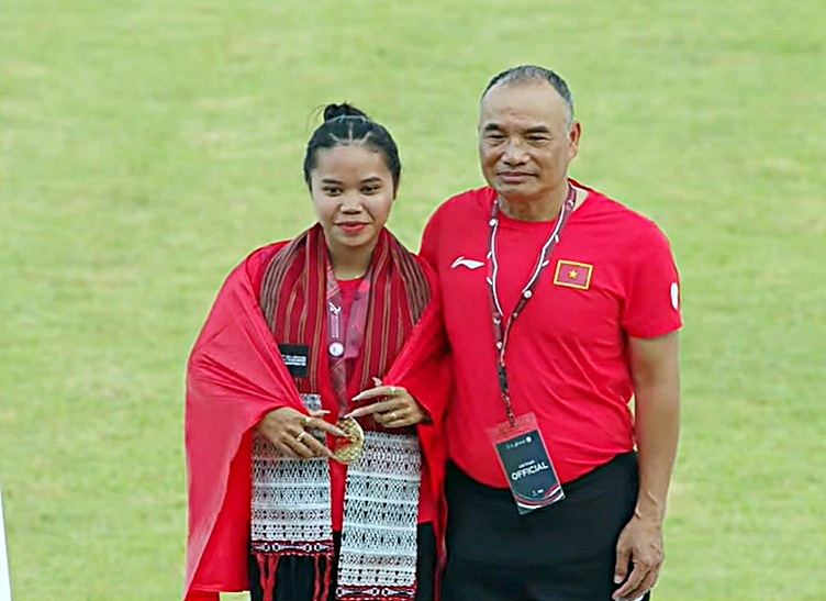 Như Quỳnh trên bục nhận HCV nhảy xa nữ lứa tuổi U20 cùng ông Nguyễn Đức Nguyên, trưởng đoàn điền kinh Việt Nam ở giải năm nay