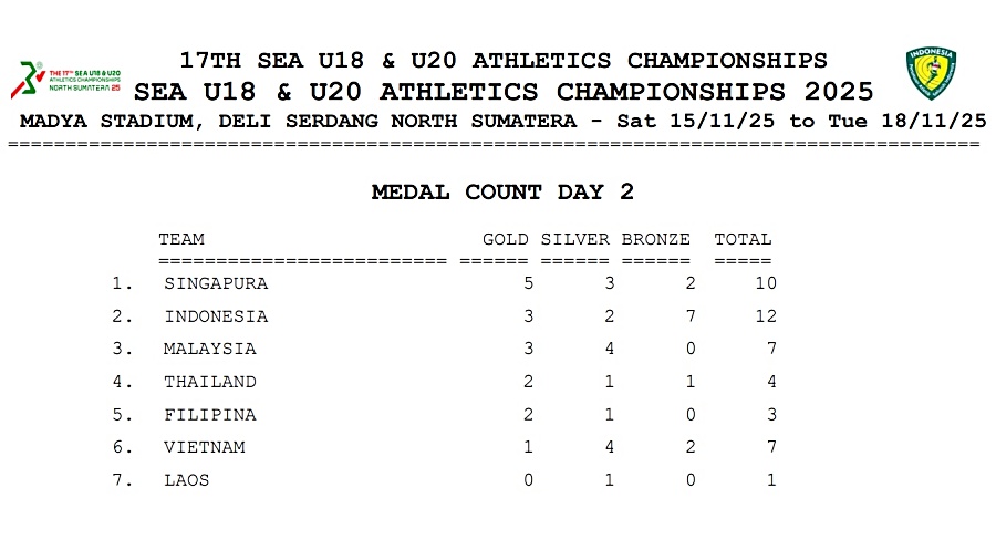 BXH huy chương ở ngày thi đấu thứ hai, 16-11, ở giải Vô địch Điền kinh Trẻ Đông Nam Á 2025