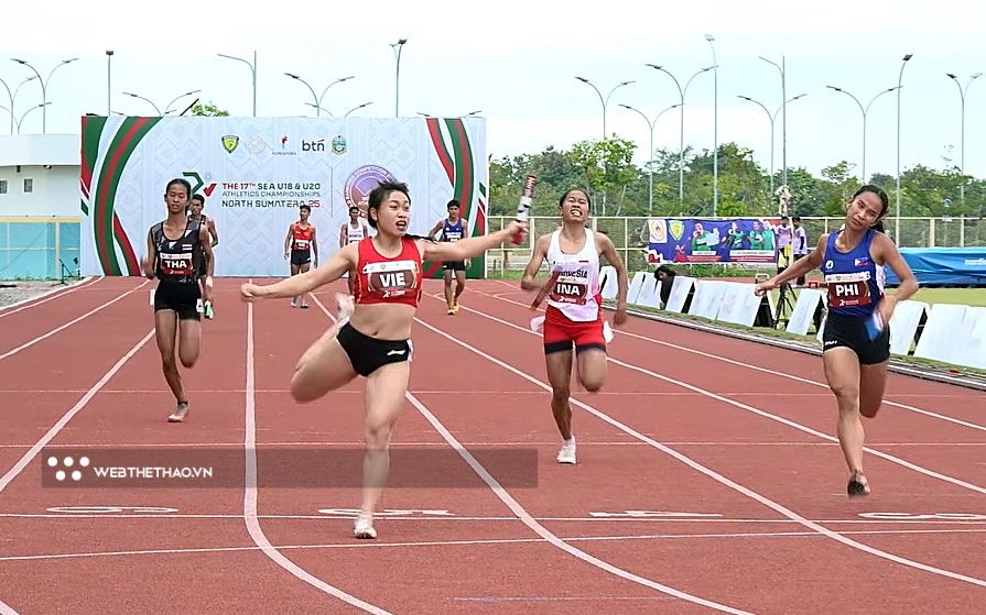 Và niềm vui còn đến bất ngờ ở đường chạy tiếp sức tốc độ hỗn hợp 4x100m nữ khi bộ tứ Thái An - Quang Giáp - Thu Hà - Quỳnh Anh đã bùng nổ giành tấm HCV lứa tuổi U18 với thông số 45.01 giây, vượt qua các đối thủ Philippines hay Thái Lan.