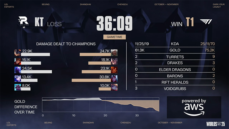Kể từ con rồng thứ 3 của ván đấu, T1 hoàn toàn áp đảo với những pha xử lý chính xác của cả 5 thành viên: Doran và Oner hoàn thành tốt nhiệm vụ càn lướt và chống chịu, Keria ngăn cản đối phương mở giao tranh bằng chiêu cuối của Ngộ Không và Ryze; kết hợp với những pha cấu rỉa có độ chính xác cao của Faker và Gumayusi, đội hình KT hoàn toàn bị bẻ gãy bởi sự hoàn hảo trong giao tranh bên phía T1. Sau 36 phút, nhà đương kim vô địch thế giới vươn lên dẫn trước 1-0 trong trận chung kết.