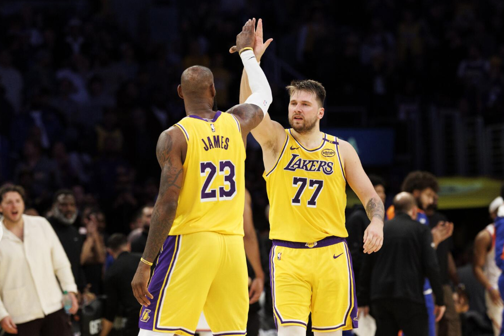 LeBron James và Luka Doncic trong một trận đấu NBA mùa giải 2024-25