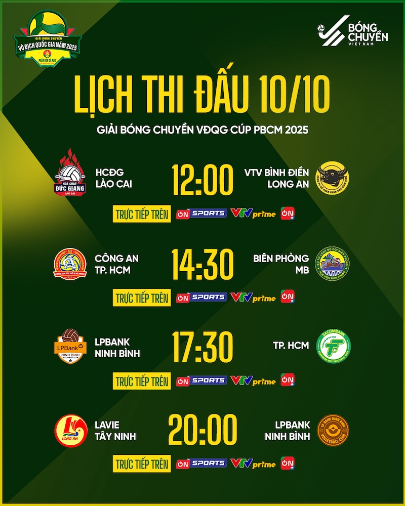 Cập nhật lịch thi đấu giải bóng chuyền VĐQG 2025 ngày hôm nay 10/10 với 4 trận đấu hấp dẫn, tâm điểm là cuộc đụng độ giữa Công An Tp.Hồ Chí Minh vs Biên Phòng.
