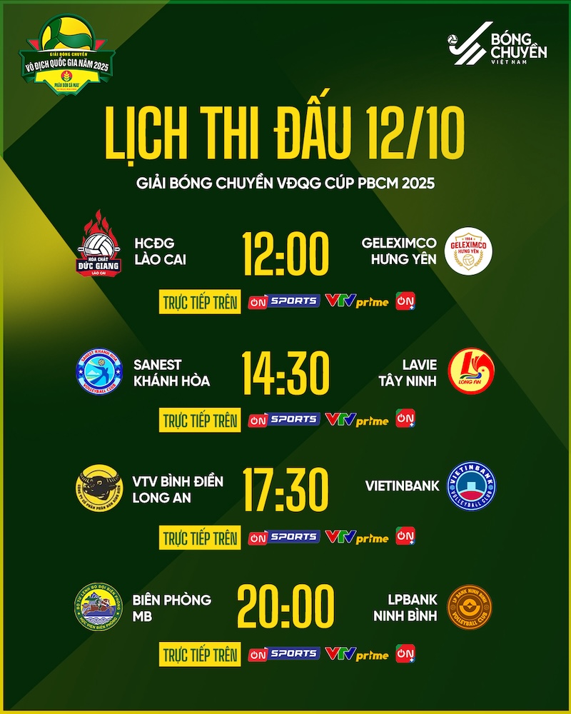 Cập nhật lịch thi đấu giải bóng chuyền VĐQG 2025 ngày hôm nay 12/10 với 4 trận đấu hấp dẫn, tâm điểm là 2 trận bán kết.